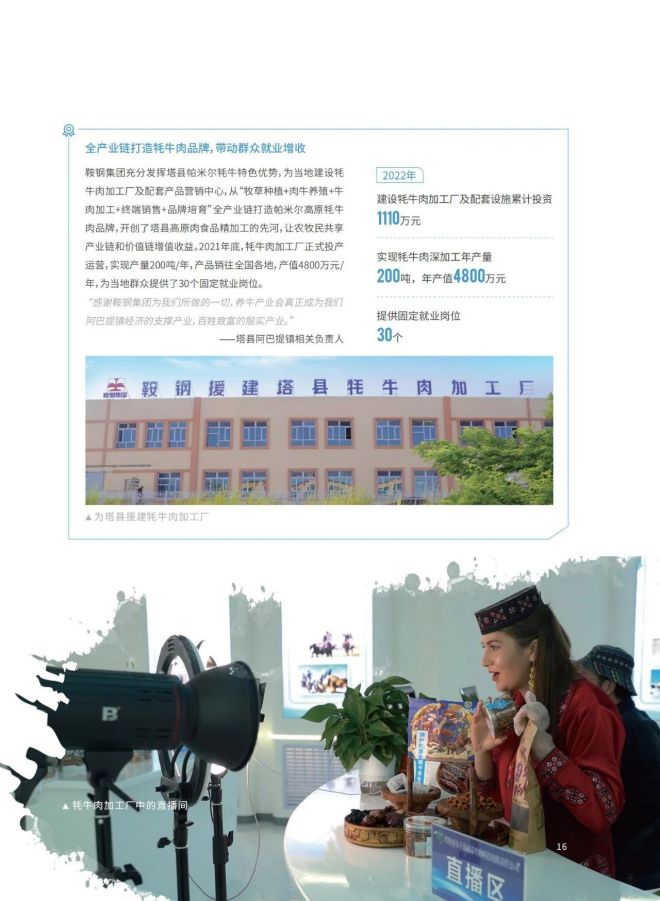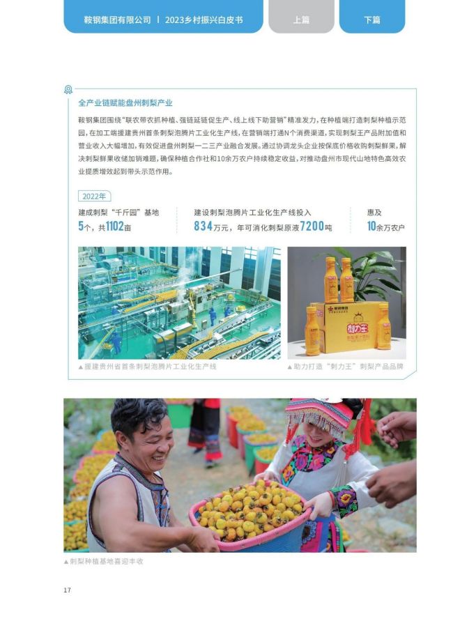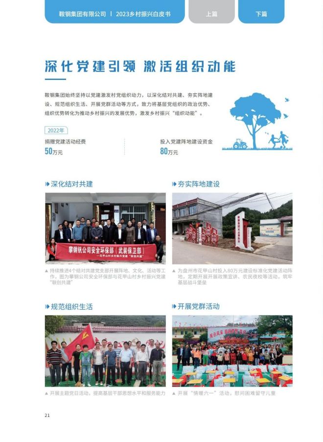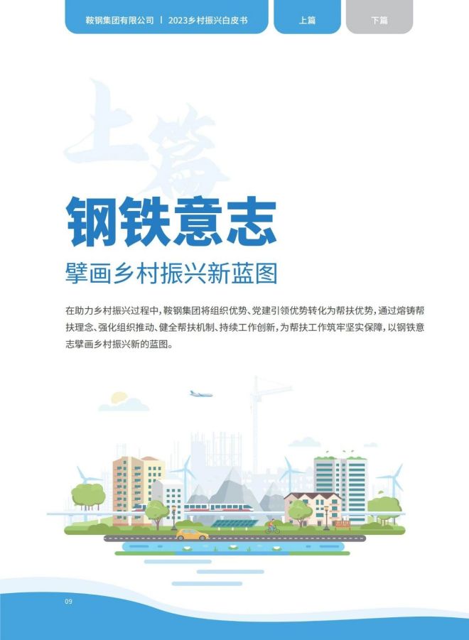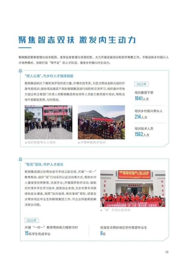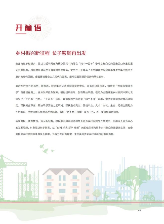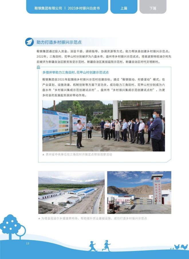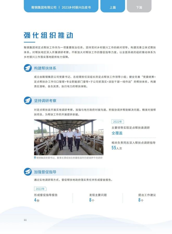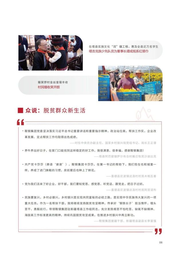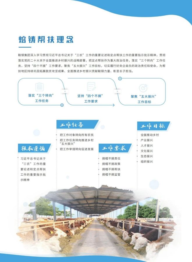 近日,《2023鞍鋼集團有限公司鄉村振興白皮書》發布,聚焦鞍鋼集團嚴格落實“四個不摘”要求,保持接續幫扶政策總體穩定、幫扶資金不減、幫扶幹部派駐力度不減、幫扶重點突出,圍繞產業、人才、文化、生態、組織全麵助力鄉村振興,持續鞏固拓展脫貧攻堅成果,做好“兩不愁三保障”重點工作,進一步深化消費幫扶。白皮書以數說、圖說、眾說的等方式生動形象地展現了鞍鋼集團幫扶工作取得的突出成績。讓我們一起翻開白皮書,了解鞍鋼集團助力鄉村振興工作成效——