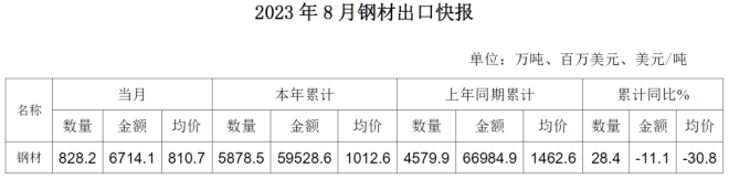 2023年8月我國出口鋼材828.2萬噸 環比增長13.3%