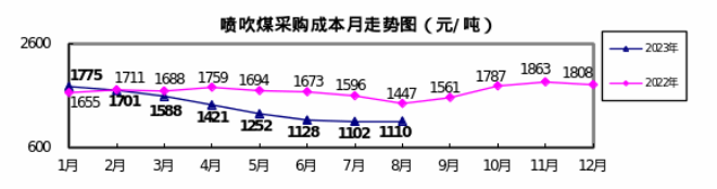 噴吹煤8月份加權平均折算成幹基的采購成本為1109.75元/噸,環比升高7.61元/噸,升幅為0.69%。1—8月累計平均折算成幹基的采購成本為1374.36元/噸,同比下降264.28元/噸,降幅為16.13%。