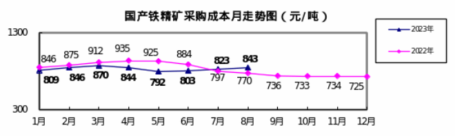 2023年1—8月,煉焦煤采購成本同比下降20.31%;冶金焦同比下降25.79%;國產鐵精礦同比下降5.09%,進口粉礦同比下降2.42%;廢鋼同比下降18.19%。