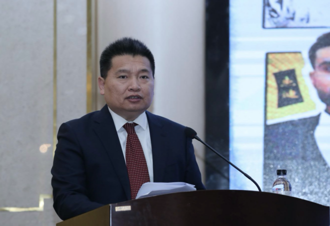 圖為中國搜索信息科技股份有限公司黨委書記、董事長、總裁李勁鬆作主題演講。