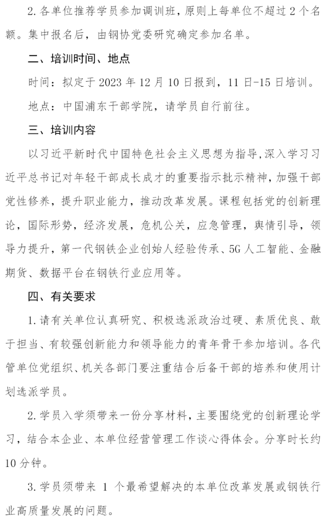 為深入學習領會習近平總書記關於青年幹部成長成才的重要講話精神,提升鋼鐵行業青年後備幹部對新階段、新理念、新格局的認識,大力弘揚企業家精神和紅色鋼鐵優良傳統,為鋼鐵工業高質量發展提供人才保障,鋼協黨委聯合中國浦東幹部學院,自2021年以來連續舉辦兩期幹部調訓班。