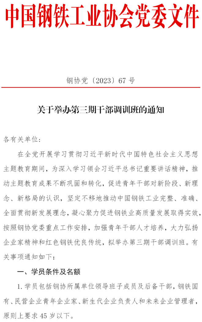 在(zai)全(quan)黨(dang)開(kai)展(zhan)學(xue)習(xi)貫(guan)徹(che)習(xi)近(jin)平(ping)新(xin)時(shi)代(dai)中(zhong)國(guo)特(te)色(se)社(she)會(hui)主(zhu)義(yi)思(si)想(xiang)主(zhu)題(ti)教(jiao)育(yu)期(qi)間(jian),為(wei)深(shen)入(ru)學(xue)習(xi)領(ling)會(hui)習(xi)近(jin)平(ping)總(zong)書(shu)記(ji)重(zhong)要(yao)講(jiang)話(hua)精(jing)神(shen),推(tui)動(dong)主(zhu)題(ti)教(jiao)育(yu)成(cheng)果(guo)不(bu)斷(duan)鞏(gong)固(gu)和(he)轉(zhuan)化(hua),促(cu)進(jin)青(qing)年(nian)幹(gan)部(bu)對(dui)新(xin)階(jie)段(duan)、新理念、新格局的認識,堅定不移地推動中國鋼鐵工業完整、準確、全quan麵mian貫guan徹che新xin發fa展zhan理li念nian,凝ning心xin聚ju力li促cu進jin鋼gang鐵tie業ye高gao質zhi量liang發fa展zhan取qu得de實shi效xiao,經jing鋼gang協xie黨dang委wei研yan究jiu決jue定ding,今jin年nian將jiang繼ji續xu聯lian合he中zhong國guo浦pu東dong幹gan部bu學xue院yuan,舉ju辦ban第di三san期qi幹gan部bu調tiao訓xun班ban。