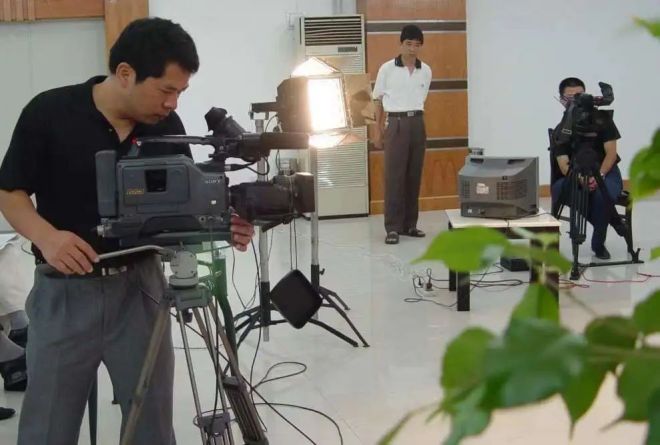 2005年5月,福建尤溪縣融媒體中心陳大勤(左)在錄製全景西岸專欄訪談現場。