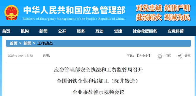 11月4日,從中華人民共和國應急管理部獲悉,應急管理部安全執法和工貿監管局召開了全國鋼鐵企業和鋁加工(深井鑄造)企業事故警示視頻會議。具體情況如下——