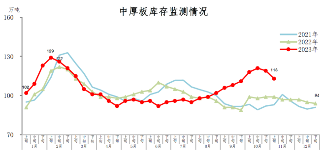11月上旬,中厚板庫存113萬噸,環比減少6萬噸,下降5.0%,庫存繼續下降;比年初增加19萬噸,上升20.2%;比上年同期增加14萬噸,上升14.1%。
