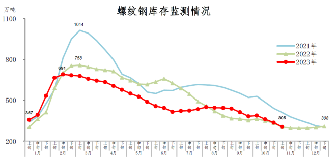 11月上旬,螺紋鋼庫存305萬噸,環比減少31萬噸,下降9.2%,庫存連續下降;比年初減少3萬噸,下降1.0%;比上年同期增加1萬噸,上升0.3%。