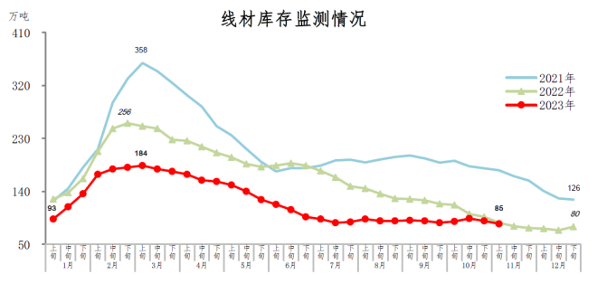 11月上旬,線材庫存85萬噸,環比減少5萬噸,下降5.6%;比年初增加5萬噸,上升6.3%;比上年同期減少2萬噸,下降2.3%。