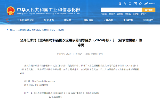 按照首批次應用保險補償機製試點工作安排,國家工信部原材料工業司已組織修訂形成了《重點新材料首批次應用示範指導目錄(2024年版)》(征求意見稿),並從2023年11月14日至11月23日公開征求社會各界意見。如有意見或建議,可於11月24日前反饋給工信部原材料工業司(郵箱:,聯係電話:)。