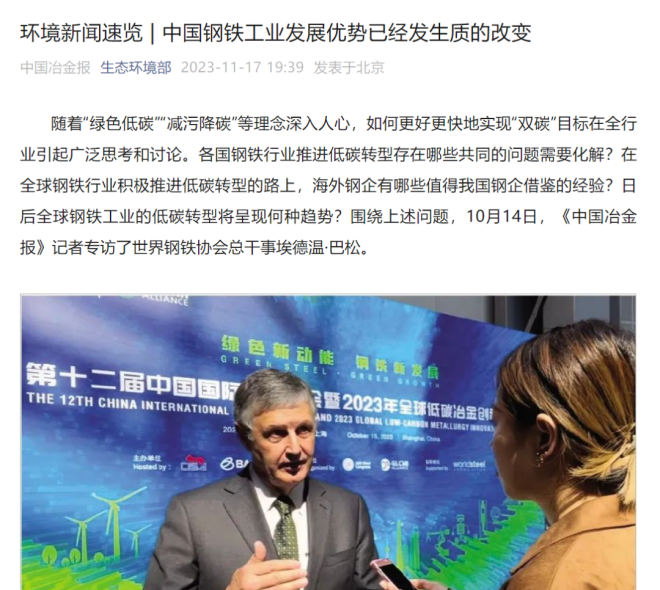 11月17日,生態環境部官微以《中國鋼鐵工業發展優勢已經發生質的改變》為題,轉載《中國冶金報》文章,關注中國鋼鐵工業的綠色低碳發展。