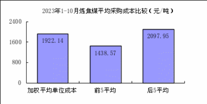 1—10月對標企業煉焦煤平均采購成本最低的前5家企業折算成幹基的加權平均采購成本為1438.57元/噸,比對標企業平均采購成本低483.57元/噸,低於平均采購成本25.16%;而采購成本最高的5家企業的加權平均采購成本為2097.95元/噸,比對標企業平均采購成本高175.82元/噸,高於平均采購成本9.15%。