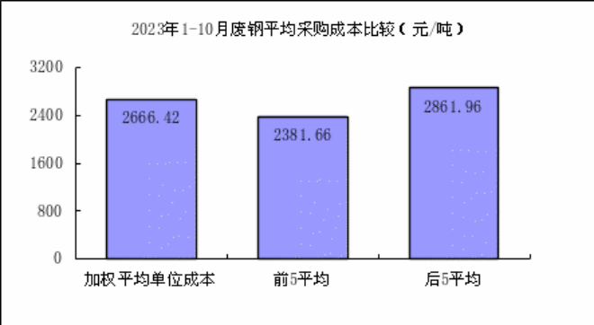 廢鋼10月份加權平均采購成本為2566.85元/噸,環比下降37.58元/噸,降幅為1.44%。1—10月累計平均采購成本為2666.42元/噸,同比下降510.64元/噸,降幅為16.07%。