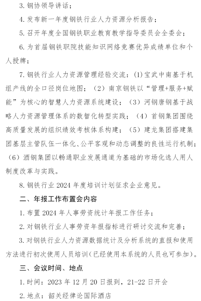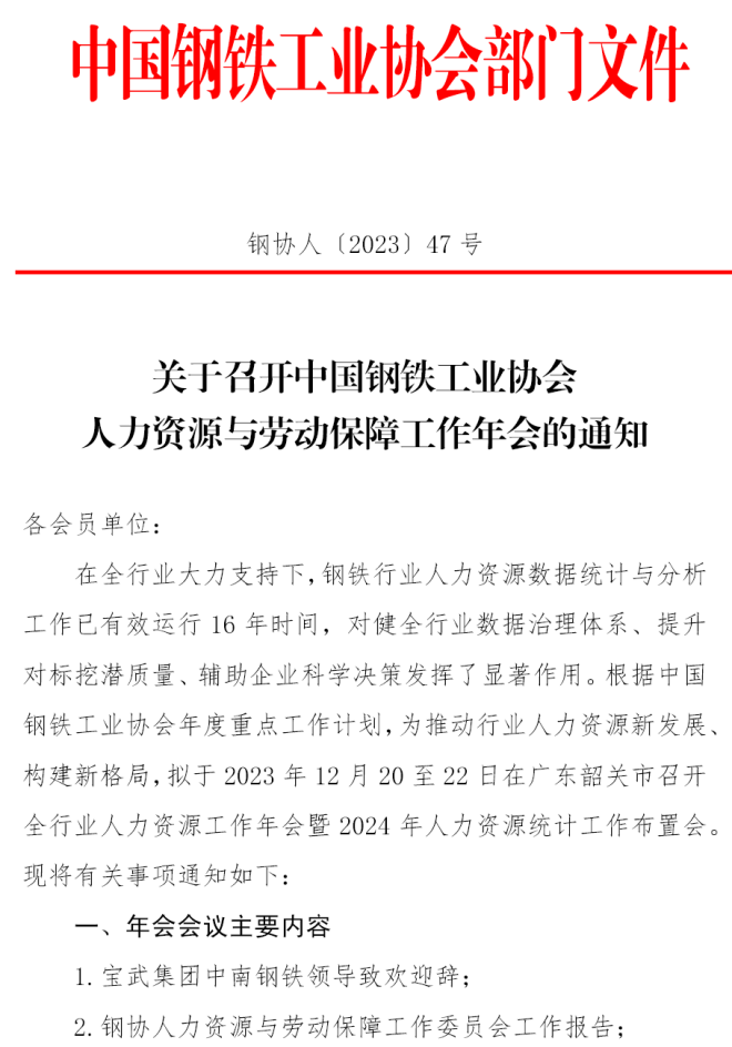 關於召開中國鋼鐵工業協會人力資源與勞動保障工作年會的通知