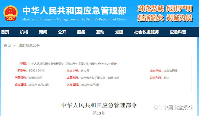 近日,中華人民共和國應急管理部發布了《中華人民共和國應急管理部令(第13號)工貿企業有限空間作業安全規定》 。