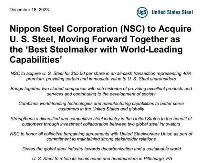 北京時間12月18日晚間,日本製鐵和美國鋼鐵公司共同宣布,日本製鐵將以55美元/股的價格對美國鋼鐵公司進行純現金收購。該交易已獲得日本製鐵和美國鋼鐵董事會的一致批準。