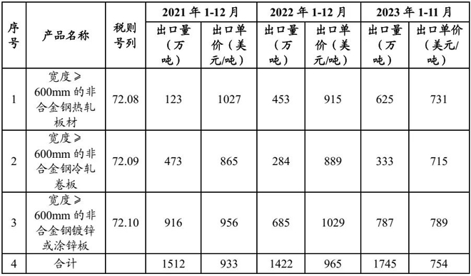 本次關稅政策調整涉及寬度≥600mm的非合金鋼熱軋板材、寬度≥600mm的非合金鋼冷軋卷板和寬度≥600mm的非合金鋼鍍鋅板(或塗鋅板)三類產品,2021年、2022年和2023年1-11月三類產品合計出口量分別為1512萬噸、1422萬噸和1745萬噸,占同期鋼材出口總量的比例分別為22.6%、21.1%和21.1%,因此,本次稅則稅目調整涉及約20%的鋼材出口量。