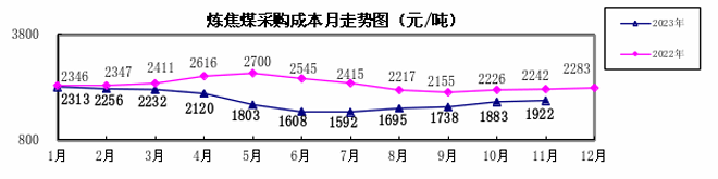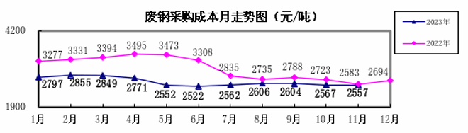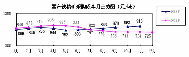 2023年1—11月,煉焦煤采購成本同比下降19.35%;冶金焦同比下降22.59%;國產鐵精礦同比下降2.06%,進口粉礦同比上升1.91%;廢鋼同比下降15.07%。