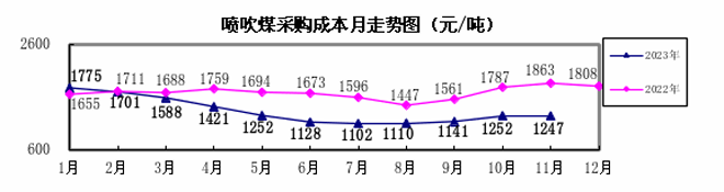 噴吹煤11月份加權平均折算成幹基的采購成本為1247.22元/噸,環比下降4.86元/噸,降幅為0.39%。1—11月累計平均折算成幹基的采購成本為1329.11元/噸,同比下降337.87元/噸,降幅為20.27%。