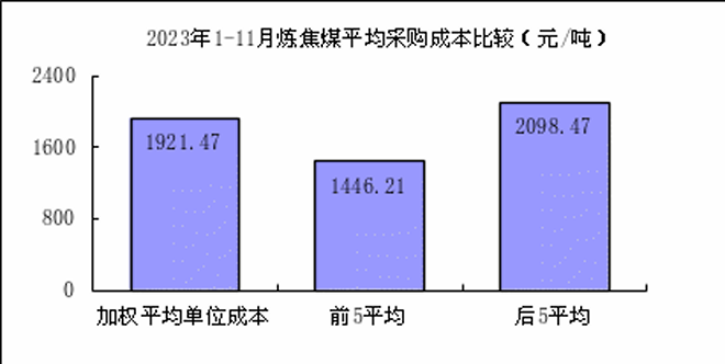 1—11月對標企業冶金焦平均采購成本最低的前5家企業的加權平均采購成本為1933.80元/噸,比對標企業平均采購成本低349.53元/噸,低於平均采購成本15.31%;而采購成本最高的5家企業的加權平均采購成本為2634.18元/噸,比對標企業平均采購成本高350.85元/噸,高於平均采購成本15.37%。