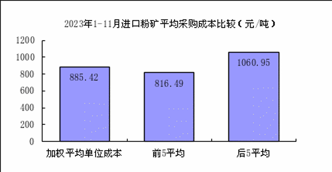 1—11月對標企業進口粉礦折算成62%品位的平均采購成本為885.42元/噸,成本最低的前5家企業的加權平均采購成本為816.49元/噸,比對標企業平均采購成本低68.92元/噸,低於平均采購成本7.78%;而采購成本最高的5家企業加權平均采購成本為1060.95元/噸,比對標企業平均采購成本高175.53元/噸,高於平均采購成本19.82%。