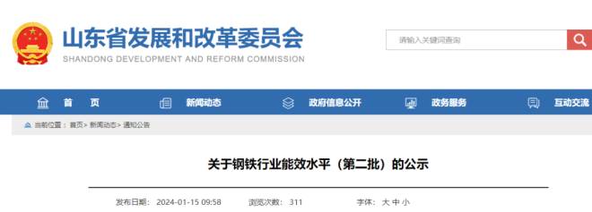 1月15日,山東省發展和改革委員會網站發布了《關於鋼鐵行業能效水平(第二批)的公示》——