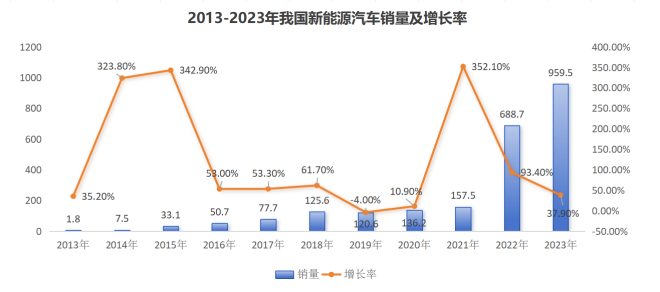 7、據中汽協數據顯示:2023年新能源汽車持續快速增長,新能源汽車產銷分別完成958.7萬輛和949.5萬輛,同比分別增長35.8%和37.9%,市場占有率達到31.6%,高於上年同期5.9個百分點,給電工鋼市場需求帶來了增量空間。不完全統計,2023年新能源汽車消耗高牌號無取向電工鋼100-120萬噸,特別是0.25mm、020mm等以及快速自粘結電工鋼的需求開始增多。下圖可看出,我國10年來新能源汽車銷量及增長率的變化。