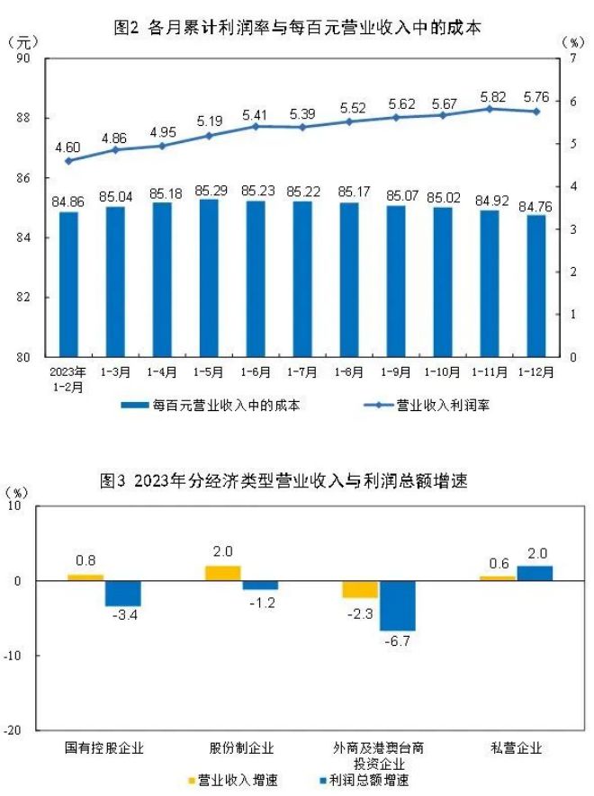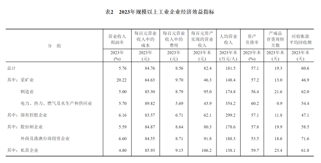 2023年,規模以上工業企業實現營業收入133.44萬億元,比上年增長1.1%;發生營業成本113.10萬億元,增長1.2%;營業收入利潤率為5.76%,比上年下降0.20個百分點。