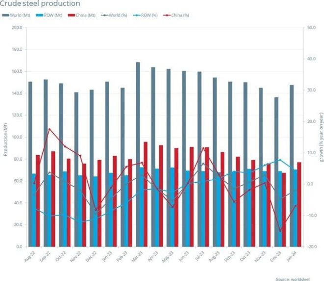 2024年1月全球粗鋼產量