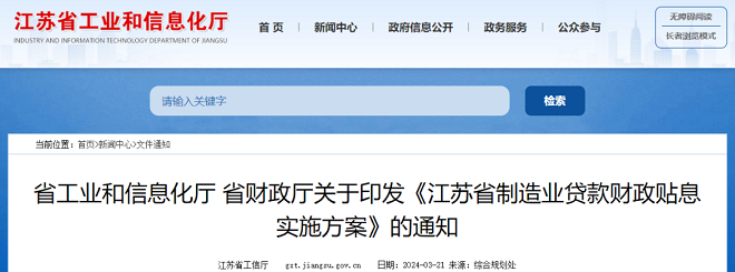 近日,江蘇省工業和信息化廳、江蘇省財政廳關於印發《江蘇省製造業貸款財政貼息實施方案》的通知(以下簡稱《通知》)。
