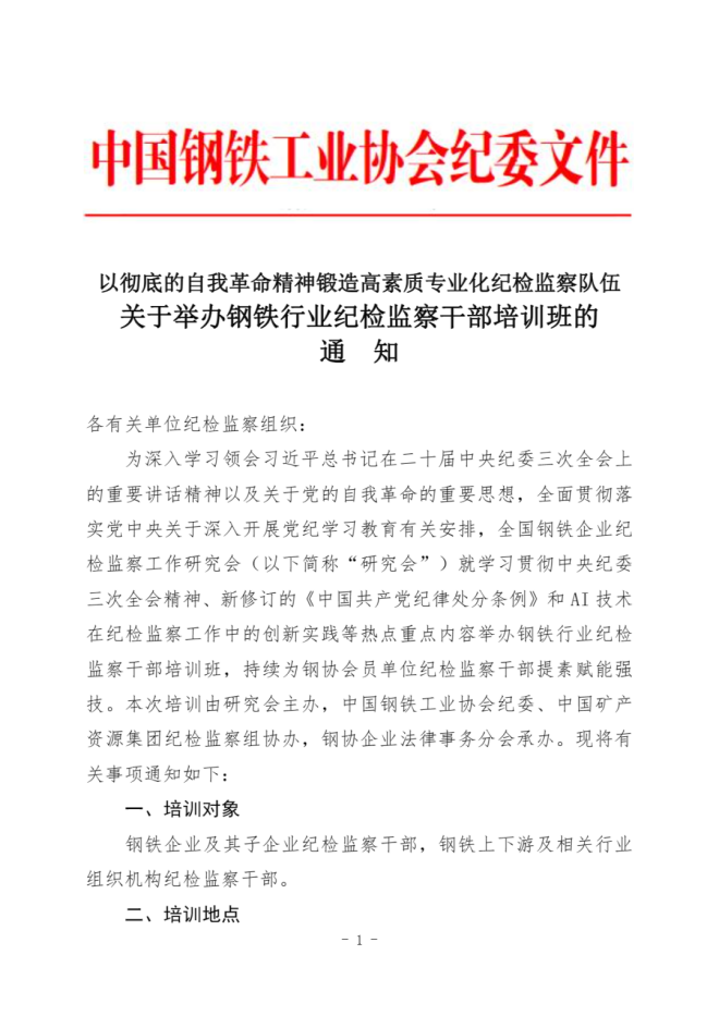 關於舉辦鋼鐵行業紀檢監察幹部培訓班的通知