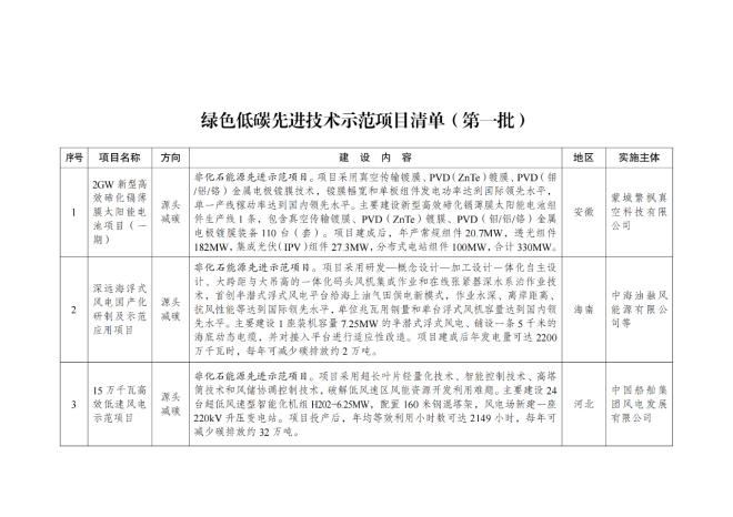 4月16日,中華人民共和國國家發展和改革委員會網站發布了關於印發《綠色低碳先進技術示範項目清單(第一批)》的通知(以下簡稱《通知》)。