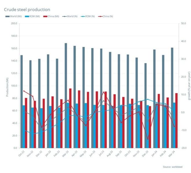 2024年3月全球粗鋼產量為1.612億噸,同比下降4.3%