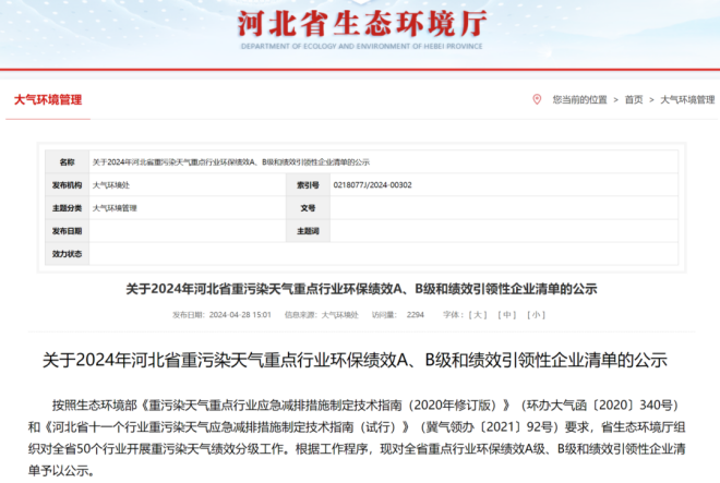 4月28日,河北省生態環境廳發布了《關於2024年河北省重汙染天氣重點行業環保績效A、B級和績效引領性企業清單的公示》(以下簡稱“公示”)。