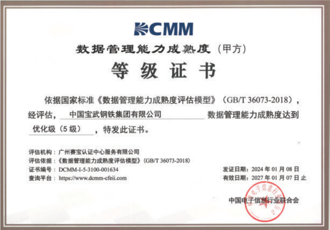 中國寶武通過“數據管理能力成熟度評估模型”(DCMM)5級認證,為國家標準的最高等級認證。