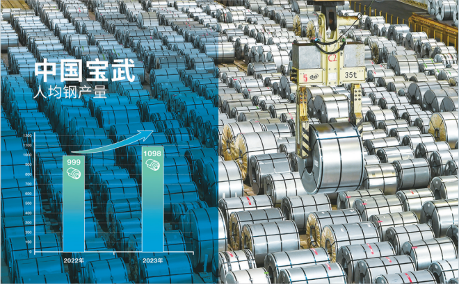 2023年,鋼鐵板塊全口徑年人均產鋼量1098噸,較上年提升9.9%。