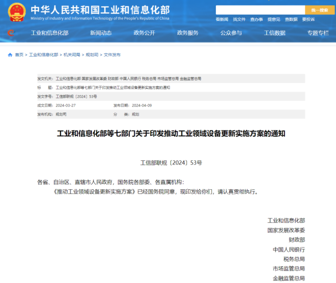 中央財經委員會第四次會議提出,要鼓勵引導新一輪大規模設備更新和消費品以舊換新。近日,國務院印發《推動大規模設備更新和消費品以舊換新的行動方案》,工信部等七部門聯合印發《推動工業領域設備更新實施方案》(以下簡稱《實施方案》),工業領域即將迎來一波“上新”機遇。