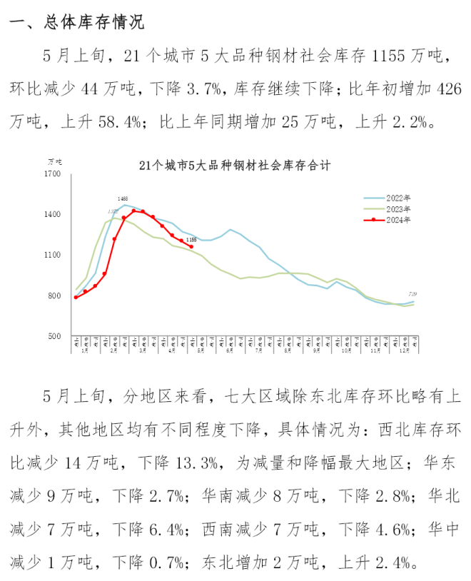5月上旬21個城市5大品種鋼材社會庫存1155萬噸 環比繼續下降