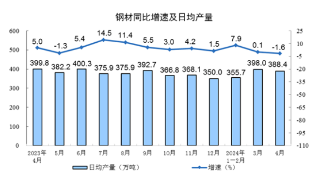 2024年4月份,我國鋼材產量11652萬噸,同比下降1.6%;1-4月份,我國鋼材產量45103萬噸,同比增長2.9%。