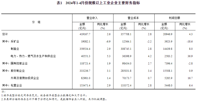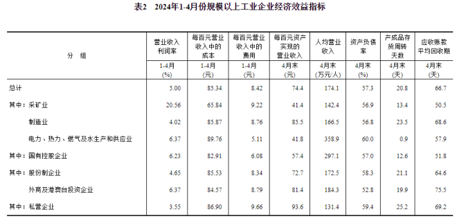 1—4月份,規模以上工業企業實現營業收入41.92萬億元,同比增長2.6%;發生營業成本35.77萬億元,增長2.8%;營業收入利潤率為5.00%,同比提高0.08個百分點。