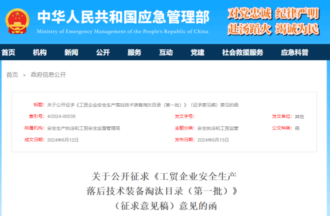 近日,中華人民共和國應急管理部發布了關於公開征求《工貿企業安全生產落後技術裝備淘汰目錄(第一批)》(征求意見稿)意見的函。