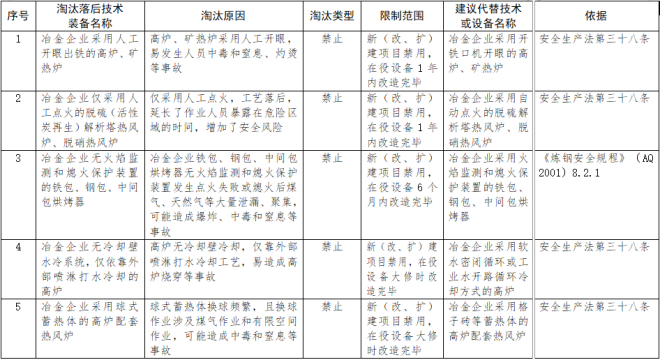 冶金行業5項落後技術裝備擬淘汰!《工貿企業安全生產落後技術裝備淘汰目錄(第一批)》(征求意見稿)發布