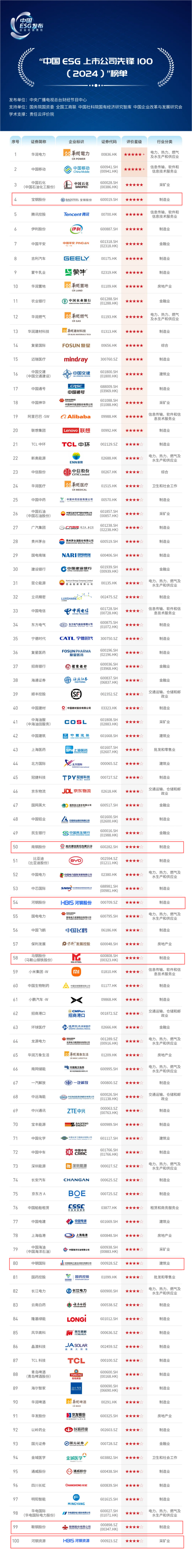 6月30日下午,中央廣播電視總台財經節目中心在北京梅地亞中心正式發布“中國ESG(企業社會責任)《2024年度ESG行動報告》”。《報告》以A股與港股6471家上市公司為樣本空間,選取972家上市公司作為評價對象,呈現中國企業ESG特征與趨勢,編製形成“中國ESG上市公司先鋒100”榜單(2024),並提出推動中國ESG高質量發展的建議。