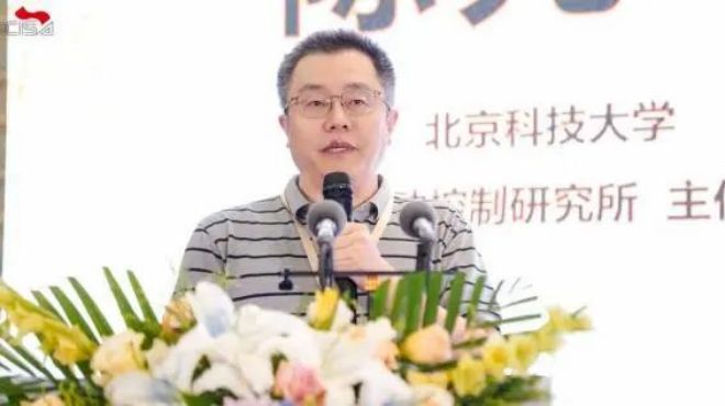 北京科技大學自動控製研究所主任陳先中做《冶煉爐高溫強衝擊載荷作業機器人振動抑振技術報告》主題演講