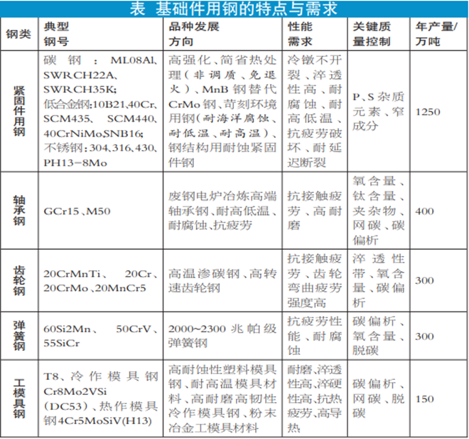 緊固件、軸承、齒輪、彈簧、工模具是機械製造的基礎件,直接影響到機械質量和可靠性。鋼鐵材料是基礎件製造的物質基礎,目前我國基礎件用鋼年產量約2400萬噸,是量大麵廣的特鋼產品。緊固件、軸承、齒輪、彈簧、工(gong)模(mo)具(ju)等(deng)服(fu)役(yi)環(huan)境(jing)各(ge)異(yi),對(dui)材(cai)料(liao)的(de)質(zhi)量(liang)要(yao)求(qiu)也(ye)各(ge)有(you)不(bu)同(tong)。可(ke)以(yi)說(shuo),基(ji)礎(chu)件(jian)用(yong)鋼(gang)質(zhi)量(liang)決(jue)定(ding)了(le)機(ji)械(xie)製(zhi)造(zao)水(shui)平(ping),也(ye)代(dai)表(biao)了(le)特(te)鋼(gang)整(zheng)體(ti)發(fa)展(zhan)特(te)點(dian)和(he)水(shui)平(ping)。