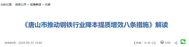 同日,唐山市人民政府網站發布了《唐山市推動鋼鐵行業降本提質增效八條措施》解讀一文。