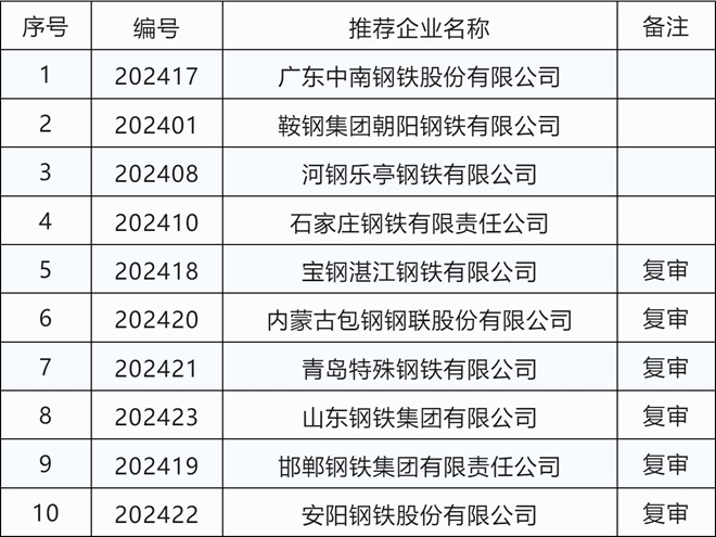 2024年度中國鋼鐵工業清潔生產環境友好企業初評工作已經結束,4家新報企業和6家複審企業獲得推薦2024年度中國鋼鐵工業清潔生產環境友好獲獎企業。具體如下: