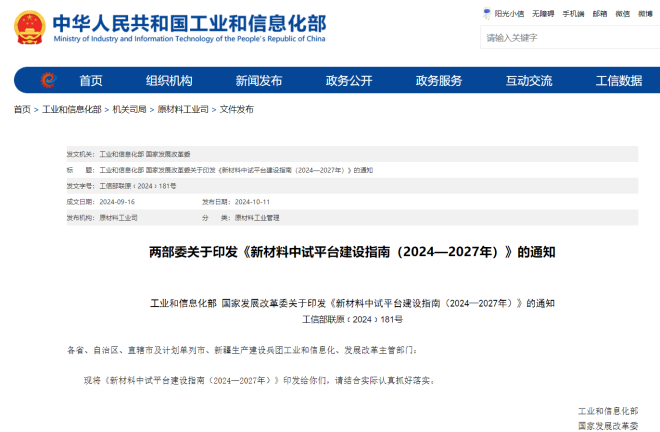 10月11日,從工業和信息化部官網獲悉,近日,工業和信息化部、國家發展改革委聯合印發《新材料中試平台建設指南(2024—2027年)》,提出到2027年,我國將圍繞石化化工、鋼鐵、有色金屬、無機非金屬、前沿材料5大領域,建成300個左右地方新材料的測試平台,也就是業內俗稱的中試平台,再從中重點培育20個左右的高水平平台。