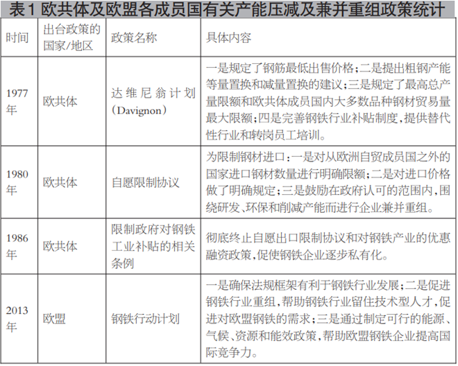 一是聚焦產能壓減,提升產業集中度。據不完全統計,從上世紀70年代至今,歐盟(歐共體)層麵出台多項政策,將本地區粗鋼產能控製在合理區間,提升本地區鋼鐵產業集中度。詳情見表1。