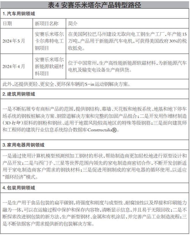 從表4可以看出,以安賽樂米塔爾為代表的歐洲鋼鐵企業在轉型升級過程中,一是聚焦新興市場及熱點領域(如增材製造、軟磁材料等),二是重點發展礦石采選與資源綜合回收業務,三是在建築、汽車用鋼等方向持續創新。
