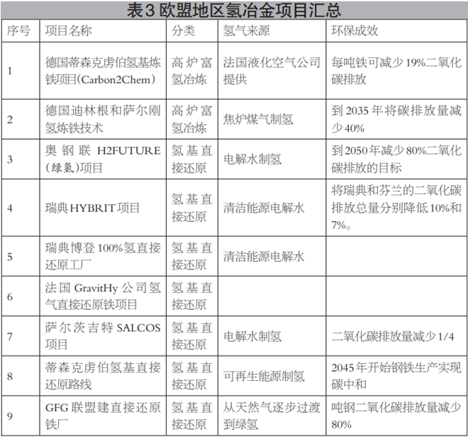 為如期實現“雙碳”目標,當前歐盟共製定了涵蓋能源、工業、建築、交通等重點排放領域,涉及居民消費、循環經濟、綠色金融、人才教育、市場機製、科ke技ji創chuang新xin等deng方fang麵mian的de數shu十shi項xiang綠lv色se轉zhuan型xing配pei套tao政zheng策ce,為wei歐ou盟meng各ge成cheng員yuan國guo鋼gang鐵tie產chan業ye綠lv色se低di碳tan轉zhuan型xing提ti供gong引yin領ling與yu支zhi撐cheng。歐ou盟meng地di區qu陸lu續xu催cui生sheng出chu多duo個ge氫qing冶ye金jin項xiang目mu,詳xiang情qing如ru表biao3。